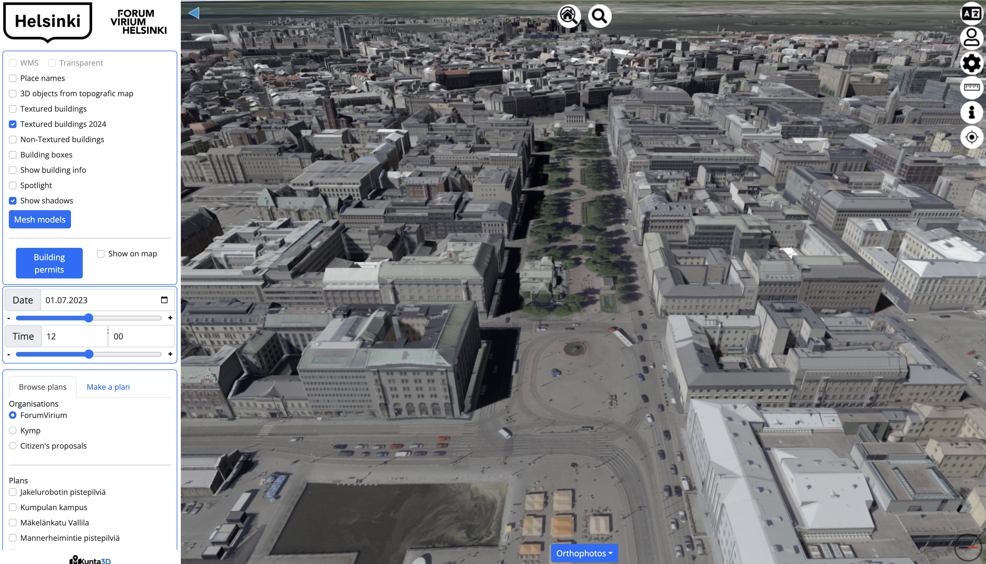 There are two next generation 3D city models of Helsinki available: a semantic city information model and a visually high-quality reality mesh model. You can view the 3D city model and download its information at http://kartta.hel.fi/3d/ . You can find more information here https://www.hel.fi/helsinki/en/administration/information/general/3d/ .The city information modelThe city information model allows users to perform a variety of analyses focusing on energy consumption, greenhouse gases or the environmental impacts of traffic, for example.The city information model includes a terrain model and buildings. Buildings are presented in two formats: flat-roofed (LoD1) and with differentiated roof structures (LoD2). The LoD2 buildings are also available textured. The buildings are all semantic CityGML objects. Each building has its own identifier (GMLID, RATU and VTJ-PRT) in the database, allowing data streams to be combined. The model uses the ETRS-GK25 plane coordinate system and the N2000 height system. The accuracy of the city information model corresponds to the accuracy of the city plan base map, meaning that buildings are located exactly where they are in the city plan’s base map.The city information modellicensed under CC BY 4.0online service platform Cesiumdatabase postgreSQL / postGISdatabase schema 3DCityDBdata model CityGML 2.0You can choose the area that you wish to download data for in the data download service. You can also choose your preferred file format and whether to download textured or untextured data. Building property data is not included.Go to the download service https://kartta.hel.fi/3d/You can also download the data directly as CityGML files, which are divided into map sheets covering four square kilometres each. The files include building property data.Go to CityGML data http://3d.hel.ninja/data/citygml/Additionally, you can download the data in WFS API service. The WFS API address is: https://kartta.hel.fi/3d/citydb-wfs/wfs. Make sure to use version 2.0.0.Helsinki Energy and Climate AtlasThe Helsinki Energy and Climate Atlas is a service produced with the city’s 3D city information model, which can be found at https://kartta.hel.fi/3d/atlas. A more detailed description of the Helsinki Energy and Climate Atlas and the data sets it contains can be found here. Some of Atlas’ source data can also be downloaded from the HRI service. The data can be used to support energy efficiency improvement, energy consumption minimization and renewable energy. The data contained in Atlas on the basic and energy information of buildings has been compiled into an excel file, the description texts of which can be found here (in Finnish). The data is from 2017. The measured district heating, electricity and water consumption data for HEKA buildings for 2015, 2016, 2017 and 2018 can also be downloaded from this page. In particular, in order to support the energy efficiency of the building stock, estimates of the heating energy consumption of almost the entire Helsinki building stock for 2020, 2025, 2030, 2035, 2040, 2045 and 2050 can be downloaded.Kalasatama Digital Twins Pilot Project’s Final ReportThe general objective of the KIRA-digi pilot project (15.5.2018 – 31.1.2019) was to produce digital twins of the Kalasatama area. The models serve as a platform for designing, testing, applying and servicing the entire lifecycle of the built environment, as well as smart city development. The progress of the project was divided into five intermediate objectives. The general objective of producing the models was the first. The sharing of 3D city models as open data was the second objective in the project. The third objective was focused on cooperation with the main partner, the Smart Kalasatama project. In the project, an online platform for activities in Kalasatama and interaction with the residents was built on the 3D model platform. The fourth objective of the project was to try out the latest ways to model, test and utilize 3D city models. This intermediate objective applies the basic idea of digital twins: “Design, test and build first digitally.” The fifth objective was to promote the exploitation of digital twins in city processes and service production. An accurate, up-to-date model of an existing city structure and the future plans will enable the development of processes, practices and services based on 3D technology.Kalasatama Digital Twins – Final Report of the KIRA-digi Pilot Project (pdf)Reality mesh of entire Helsinki (2017)The reality mesh model is a photorealistic city model that, according to its name, it is a visually high-quality and geometrically accurate model based on aerial photographs. The model has the advantage of being realistic: the model includes all the items that were stationary at the time of photography, such as small structures, trees and parked cars. These city-wide mesh models have been produced aerial photographs taken at summer 2017 and 2015. The 2017 model has been produced with over 42,000 aerial photographs with a ground sample distance of about 7.5 cm / pixel. You can download the model in OBJ format, which contains each level of detail, and the LoD type is adaptive tree.View the index map of the data here and corresponding file names here. You can download the model in OBJ format from a map view here. You can view the model here: https://kartta.hel.fi/3d/mesh. The model can be 3D printed with Helsinki 3D Cityloader (more information here).3MX / 3SM Files & ContextCapture ViewerThe 3MX and 3SM file formats can be viewed with the CC Viewer, which can be downloaded for free after registration. The 3SM file format can also be used in Bentley MicroStation CE version generation software as a reference file/background map.Reality mesh model of Kalasatama (2017)The 3D model of Kalasatama area is based on aerial photographs taken in summer 2017. You can download the model in DAE, FBX, OBJ, 3D Tiles and 3MX/3SM formats. View the reality mesh 